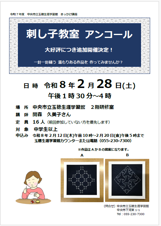玉穂生涯学習館きっかけ講座「刺し子教室アンコール」は定員に達しましたので受付を終了いたしました。